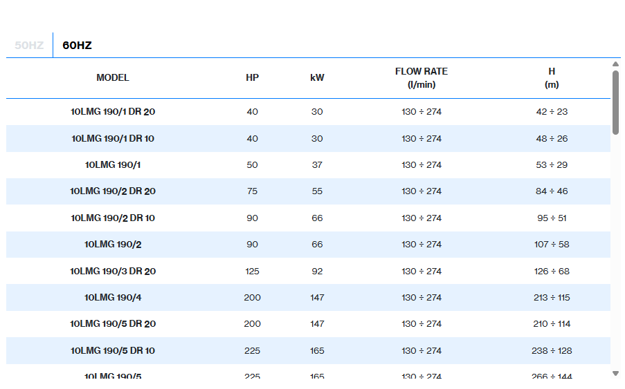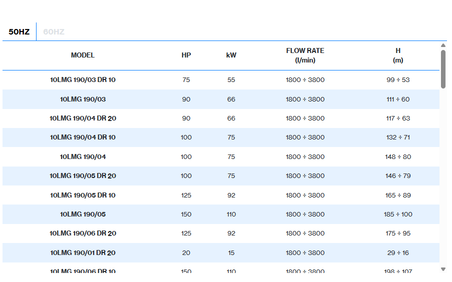 Submersible multistage centrifugal pumps for 10” wells. Check valve built into the delivery outlet. Pump flange for coupling with motors are made according to NEMA standards. Most common applications are civil and agricultural.