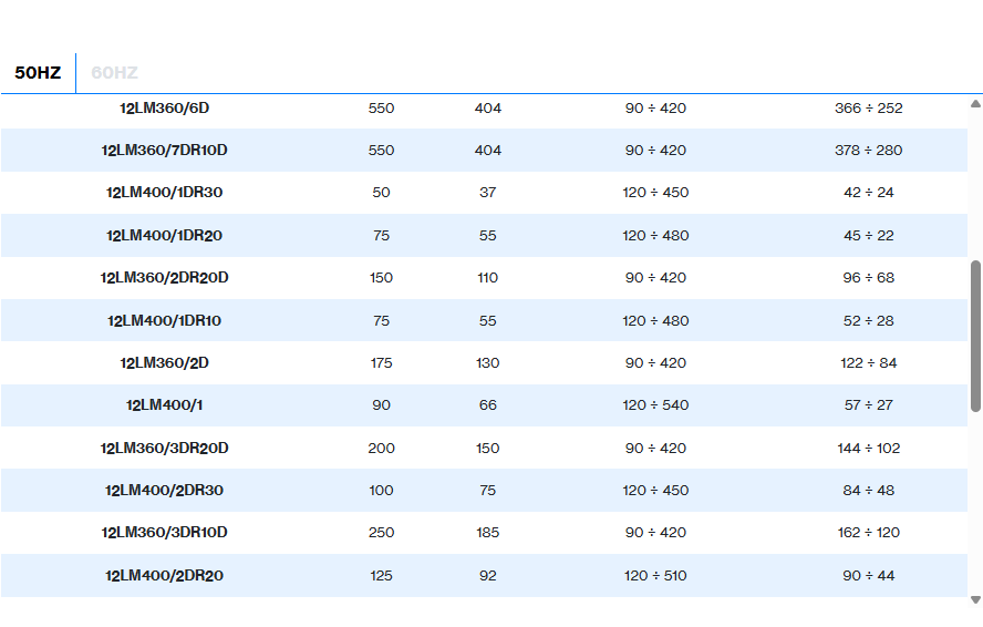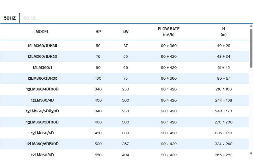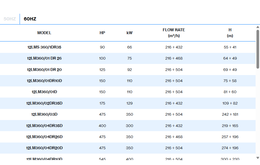 | Impellers and diffusers | stainless steel AISI 304 (LMS), stainless steel AISI 316 (LMX), Duplex (LMD) |