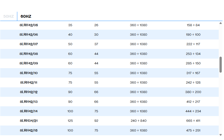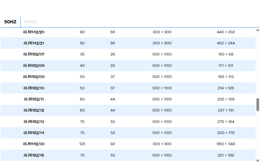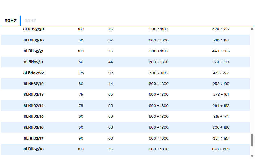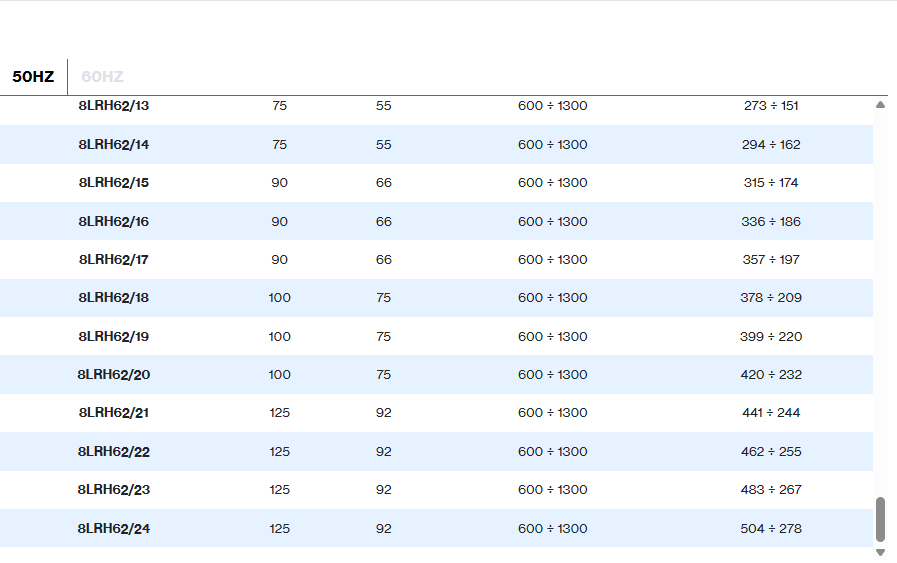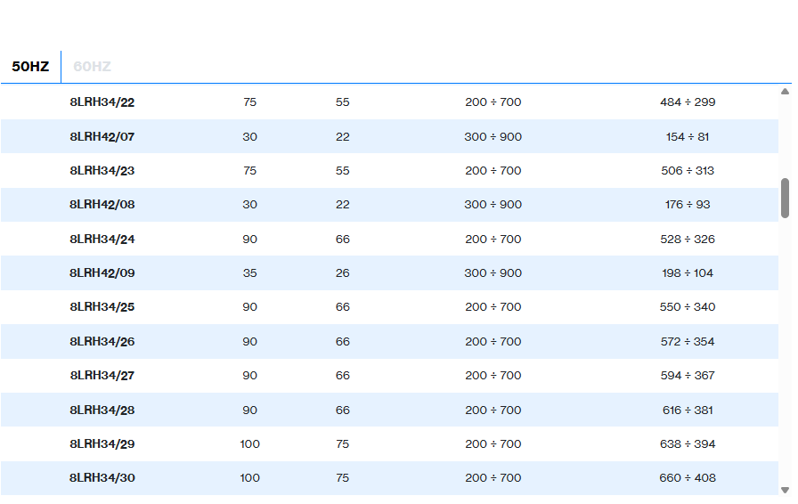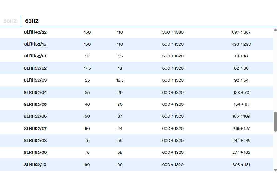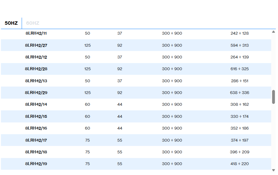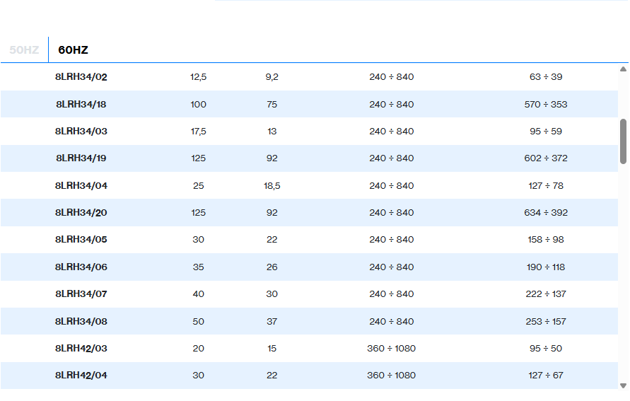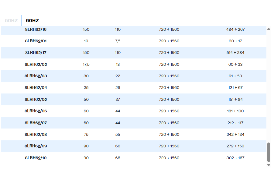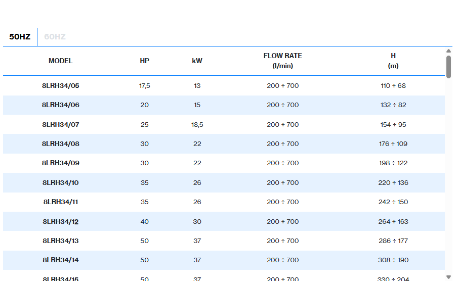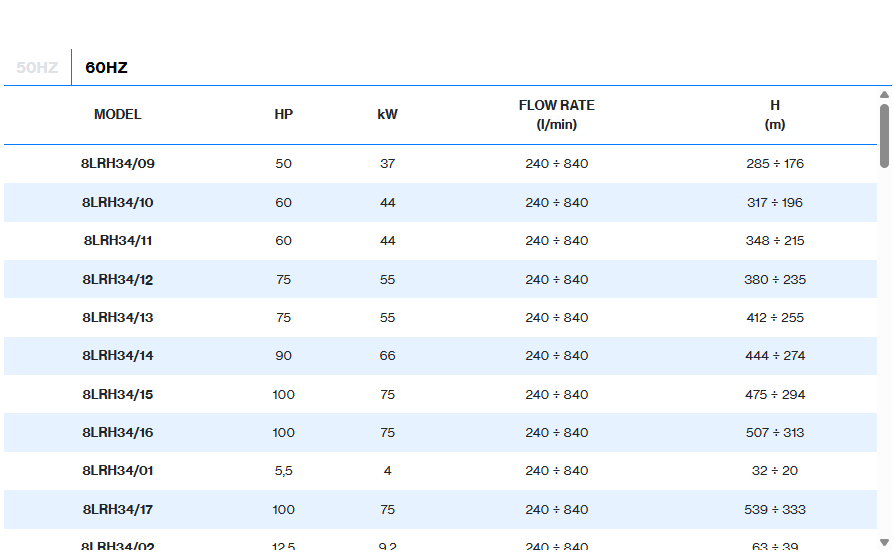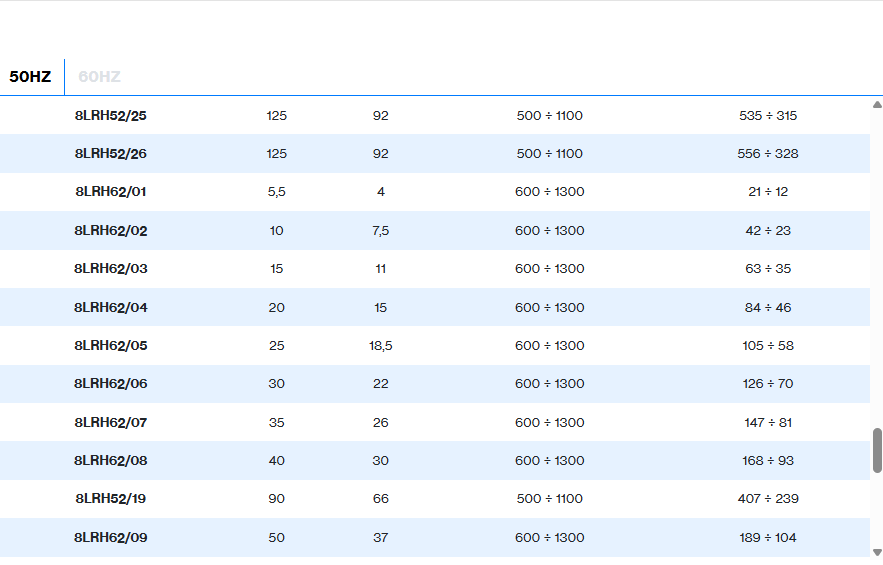 | Impellers and diffusers | stainless steel AISI 304 (LRHS), stainless steel AISI 316 (LRHX), Duplex EN 1.4462 (LRHD) |