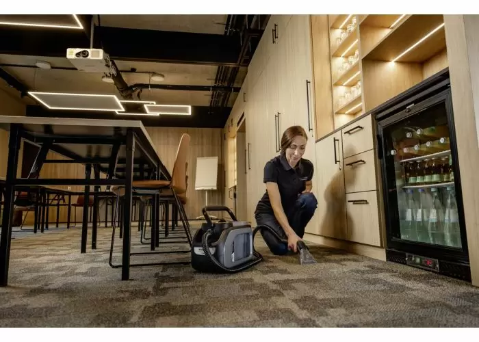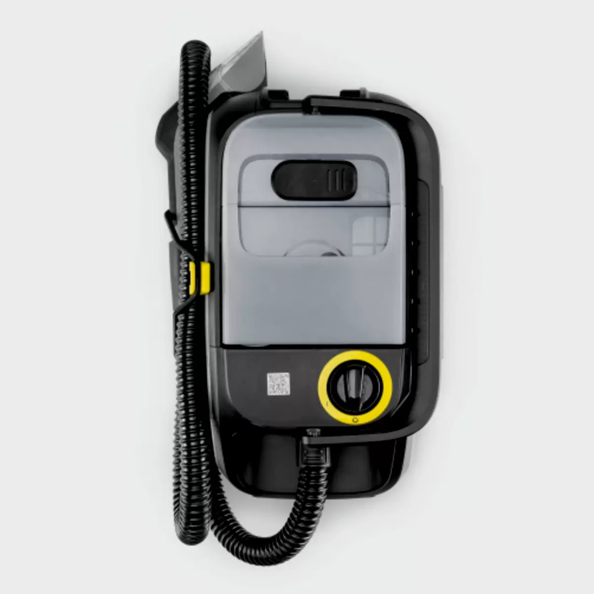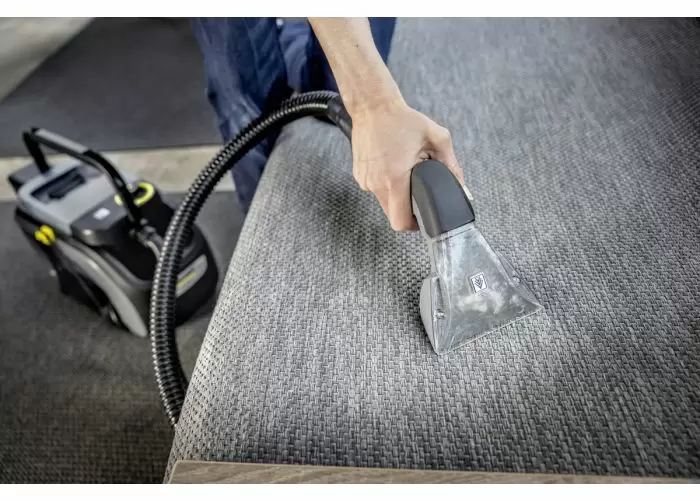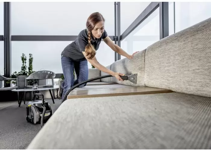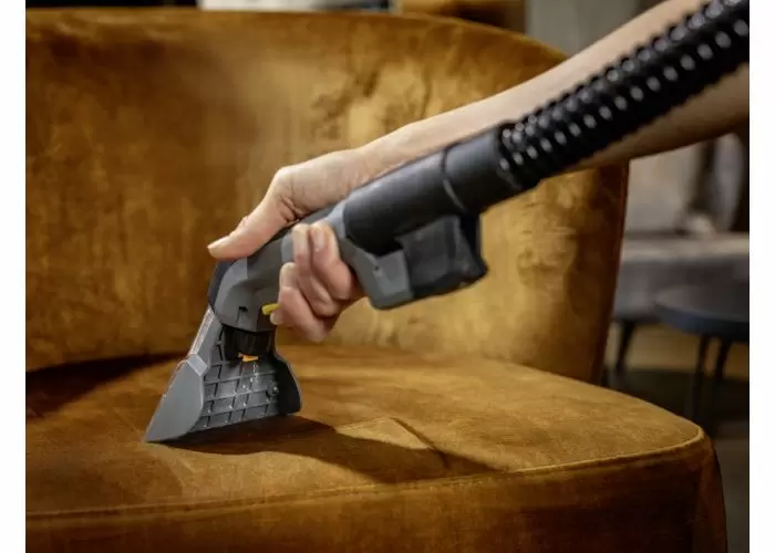 Robust, durable and powerful with cordless flexibility: our Puzzi 2/1 Bp battery-powered spray extraction cleaner. This portable battery-powered spray extraction machine can also be used for spot cleaning and stain removal, making light work of fresh or dried-on stains on textiles such as upholstered chairs, sofas, car seats and much more. The Puzzi 2/1 Bp removes all stains in no time at all thanks to its outstanding vacuuming performance, which also ensures fast drying times. Thanks to its compact design, low weight and ergonomic carrying handle, the machine is easy to carry one-handed. For the best stain removal results, the cleaning solution is pressurised and sprayed deep into the textile fibres before being vacuumed back up together with the loosened dirt. Supplied as standard: upholstery nozzle, spray/suction hose, separate containers for fresh and dirty water and integrated accessory storage. When ordering this machine version, please bear in mind that the powerful 36 V Kärcher Battery Power+ battery and the corresponding fast charger must be ordered separately.