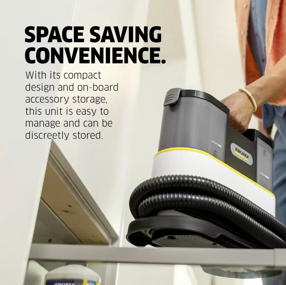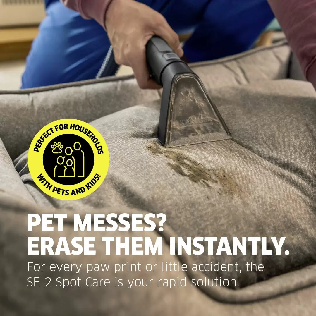 The handy SE 2 Spot Care Spot cleaner is the perfect helper for instantly removing fresh or built-in stains on upholstery and textiles including carpets and sofas. The SE 2 Spot Care makes quick work of dirt and odours, effectively removing food and drink stains, as well as paw prints, perfect for use with pets. Thanks to its compact design, it is particularly easy to use and takes up little space when stored. That means it’s quickly ready for operation whenever you need to deal with unexpected dirt. The large operating radius made possible by the 4.5-metre cable and 1.8m suction hose allows for flexible cleaning anywhere in a room. The practical accessory storage on the device itself means that all attachments, including a spot brush for a deeper clean, are quickly to hand and ready for use. Includes stain-removal brush, upholstery nozzle and detergent. Feature and Benefits Proven Karcher technology for optimum cleaning results Cleaning deep into the fibres of textile surfaces. Low residual moisture for quick drying of textile surfaces. Effortless and fast cleaning due to efficient spray extraction cleaning method in combination with a powerful yet energy-efficient motor. Specially developed accessories for easy fibre-deep cleaning The upholstery spray extraction nozzle can be used to clean ingrained dirt quickly and easily, while the spray extraction crevice nozzle makes light work of cleaning particularly hard to reach areas. Integrated spray hose for added convenience when cleaning. Long, highly flexible suction hose for added convenience when cleaning. Ultra-compact space-saving device Flexible, also in narrow areas or areas that are difficult to access. With practical handle for fast and convenient transport of the device. Space-saving storage. Specifications Technical data Rated input power (W) – 450 Operating radius (m) – 6.3 Fresh water container capacity (l) – 1.5 Dirty water container capacity (l) – 0.8 Power supply (V/Hz) – 220 – 240 / 50 – 60 Power Cable (m) – 4.5 Colour – white Weight without accessories (kg) – 4 Weight incl. packaging (kg) – 6 Dimensions (L Ă— W Ă— H) (mm) – 385 x 215 x 310 Equipment Cord storage 2-tank system Practical hose and accessory storage SE_2_SPOT_CARE_OPERATING_INSTRUCTIONS