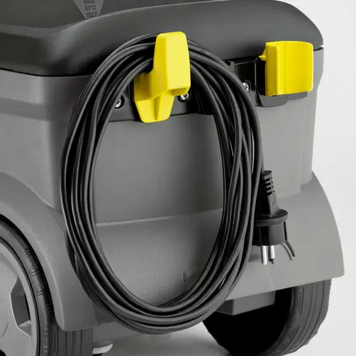 Puzzi 10/2 Adv: Spray extraction machine with defoamer dosage, cleaning agent compartment, integrated cable hook, holder for handle with trigger/suction pipe and a power outlet for PW 30/1 for improved area performance.