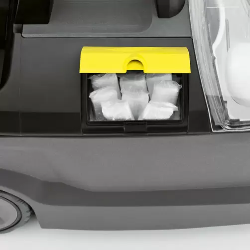 Puzzi 10/2 Adv, the spray extraction machine with 2 bar spray pressure. Ideal for cleaning textile surfaces. With the PW 30/1 roller brush connected, the Puzzi 10/2 Adv is impressive, even on medium-sized surfaces. The integrated defoamer dosage prevents too much foam from forming in the dirty water tank, especially when rinsing shampooed carpets. With defoamer dosage, storage compartment for cleaning agent tabs, power outlet for PW 30/1 to increase area performance, integrated cable hook and holder for handle with trigger and suction pipe. Feature and Benefits Perfectly suitable for everyday use. Adjustment of the handle without any tools; accessory/cord fixings; quick change from floor to upholstery nozzle. Quickly adapts to different requirements. Simple, easy to learn operating concept. Improved cleaning performance With integrated adapter for the PW 30/1 additional power brush. High cleaning performance. Integrated roller brush for raising the pile. Storage compartment for cleaning agent tablets With practical on-board storage compartment for tabs. For need-based dosing. Specifications Technical data Max. area performance (m²/h) – 30 – 45 Air flow (l/s) – 54 Vacuum (mbar/kPa) – 254 / 25.4 Spray rate (l/min) – 2 Spray pressure (bar) – 2 Fresh/dirty water tank (l) – 10 – 9 Turbine capacity (W) – 1250 Pump power (W) – 80 Voltage (V) – 220 – 240 Weight without accessories (kg) – 11.5 Dimensions (L × W × H) (mm) – 705 x 320 x 435 Equipment Spray hose with integrated water feed, 2.5 m Power outlet for professional power brush, PW 30/1 RM 760 tablets, 2 piece(s) Storage compartment for cleaning agent tablets Additional handle Fixing for manual nozzle Cable hook Narrow floor nozzle with flexible suction lip Handle with trigger